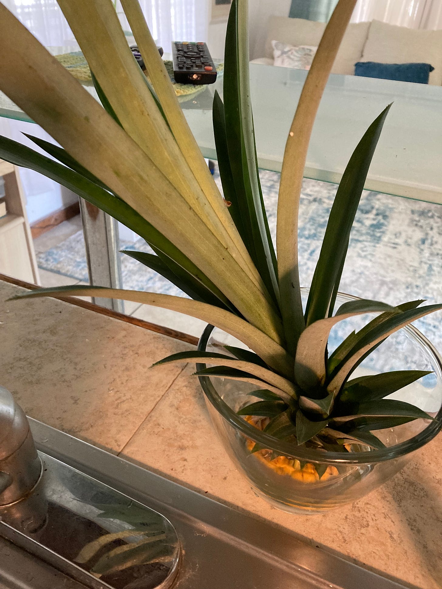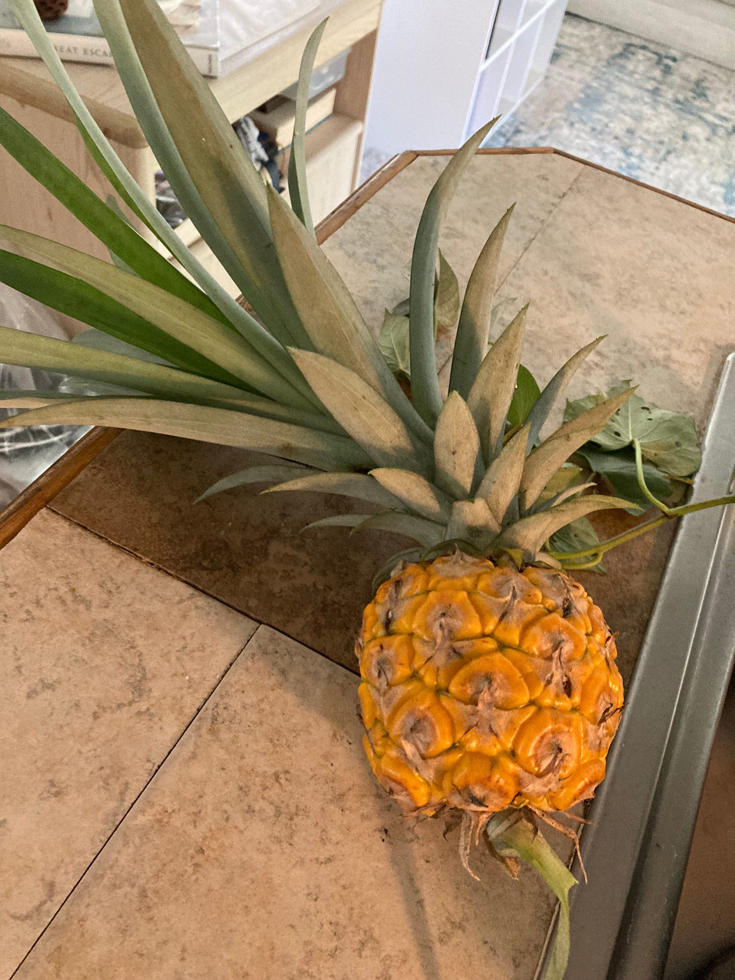 I never toss a pineapple top. They take forever to produce, but they always do, and they’ll grow in anything, pots or in the ground. Right now, I have close to a dozen plants with another new fruit in the making. The great thing about pineapples is they can be clustered together with several to a container. The top from my new baby pineapple will share a planter with my amaryllis and canna lilies.